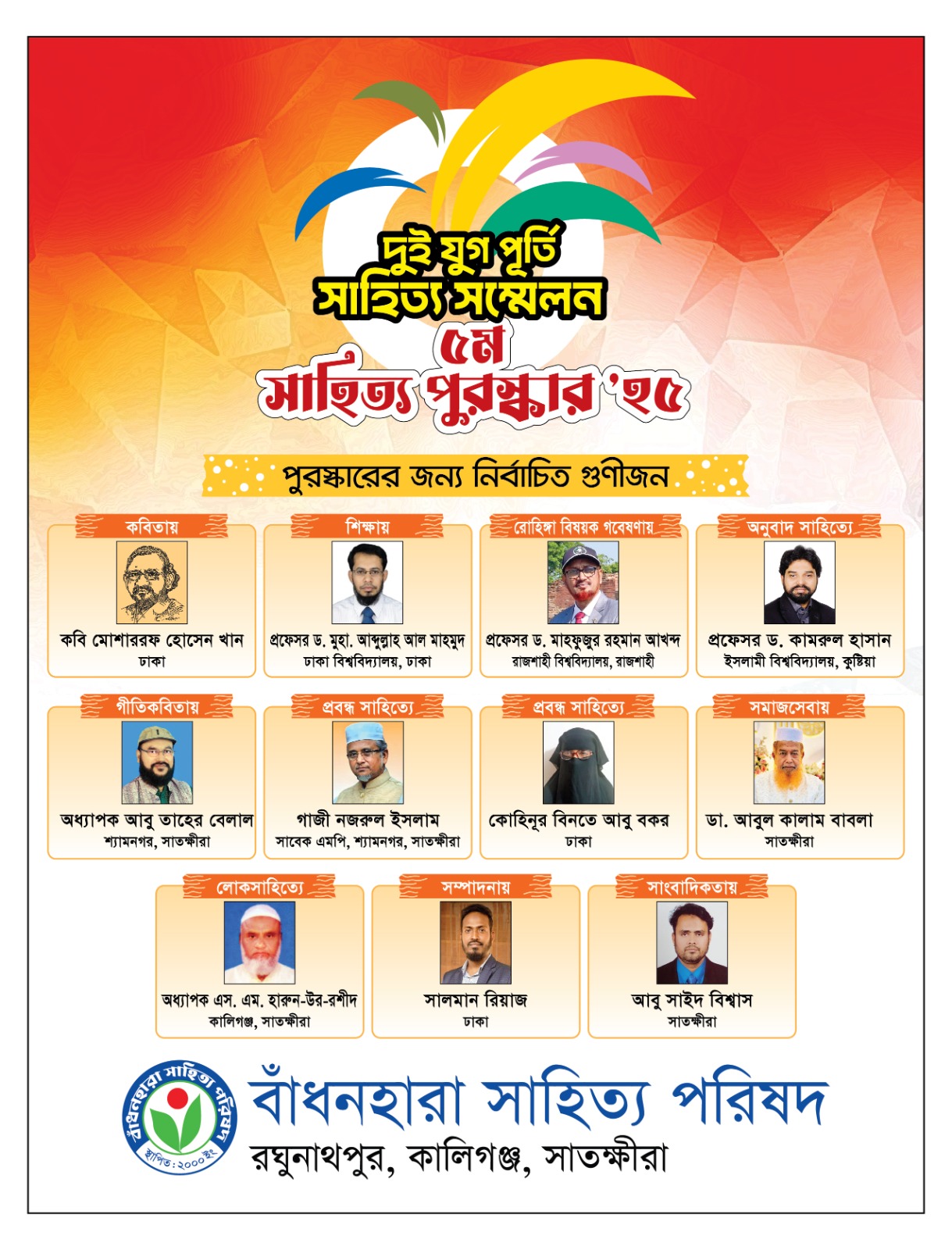 বাঁধনহারা সাহিত্য পরিষদের উদ্যোগে দুই যুগ পূর্তি উপলক্ষে এক বর্ণাঢ্য সাহিত্য সম্মেলন ও ৫ম সাহিত্য পুরস্কার প্রদান অনুষ্ঠান ২০২৫ অনুষ্ঠিত হতে যাচ্ছে। আগামী ১ মে ২০২৫ রোজ বৃহস্পতিবার কালিগঞ্জ উপজেলার কিষান মজদুর ইউনাইটেড একাডেমি প্রাঙ্গণে এই অনুষ্ঠানের আয়োজন করা হয়েছে।